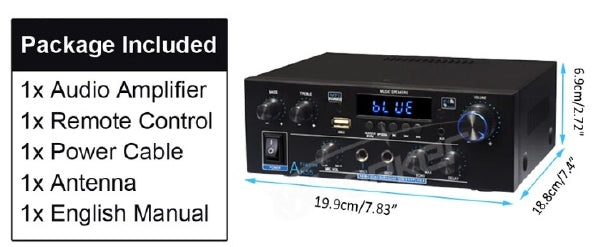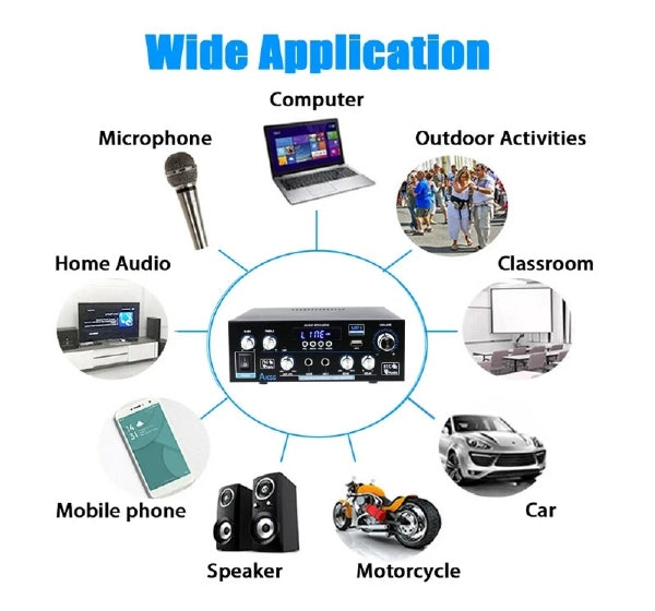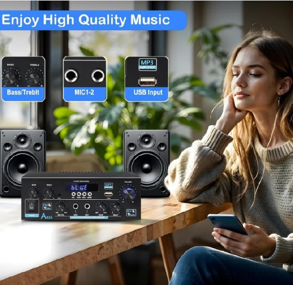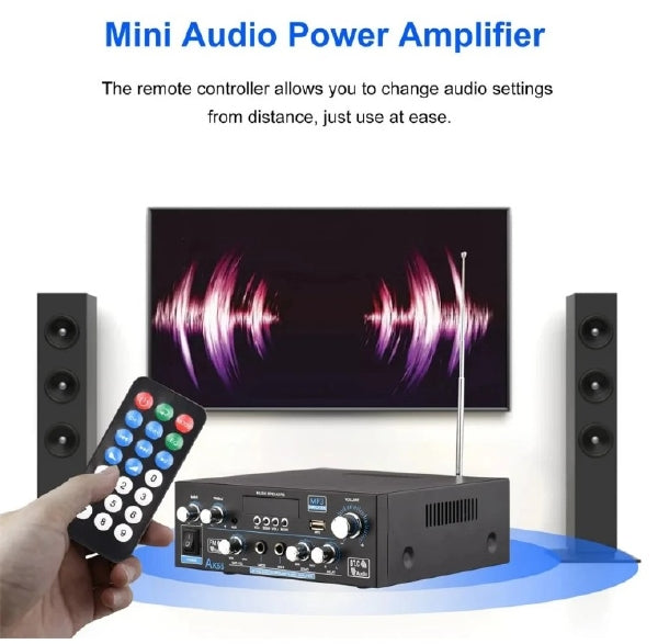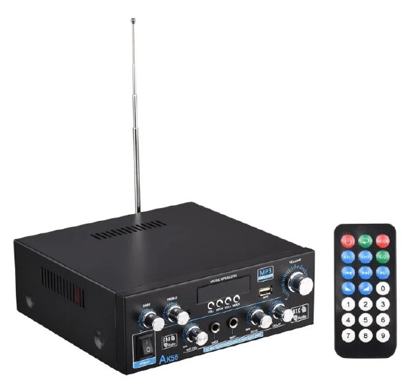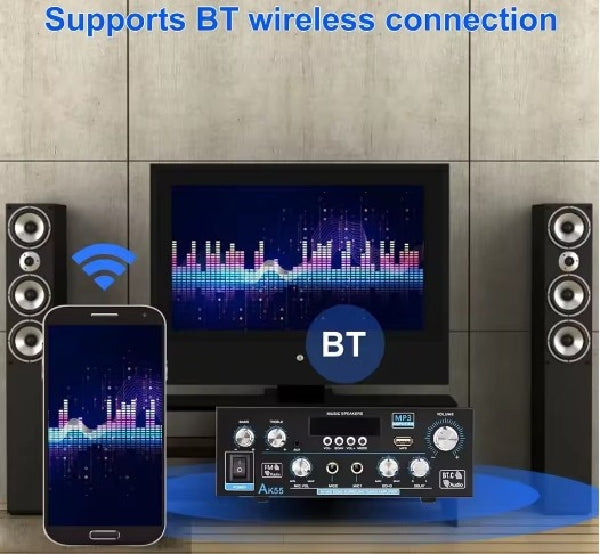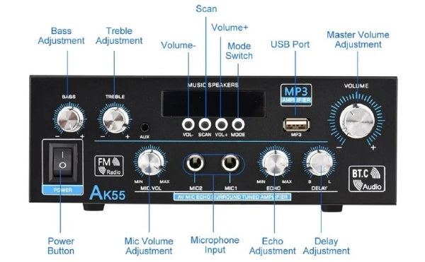 Product: Â 900W HiFi Digital Amplifier - Channel 2.0 - Bluetooth 5.0 Surround Sound Amplifier, Maximum Power 90Wx2 Speaker Amplifier for Home - AK55 Â Description: Â The AK55 HiFi Digital Amplifier is a compact, versatile 2.0-channel stereo amplifier designed for home audio systems and karaoke, featuring Bluetooth 5.0 connectivity and multiple input options, including optical, coaxial, USB, and dual microphone jacks. It offers up to 90W per channel RMS power output with bass, treble, echo, and delay controls. The AK55 is a power amplifier suitable for a variety of use cases, from home theaters to small offices or garages. Its key features include: Audio Control: Dedicated knobs allow independent adjustment of bass, treble, microphone volume, and master volume, plus echo and delay effects for the microphone inputs, making it ideal for karaoke. Â Features: Â